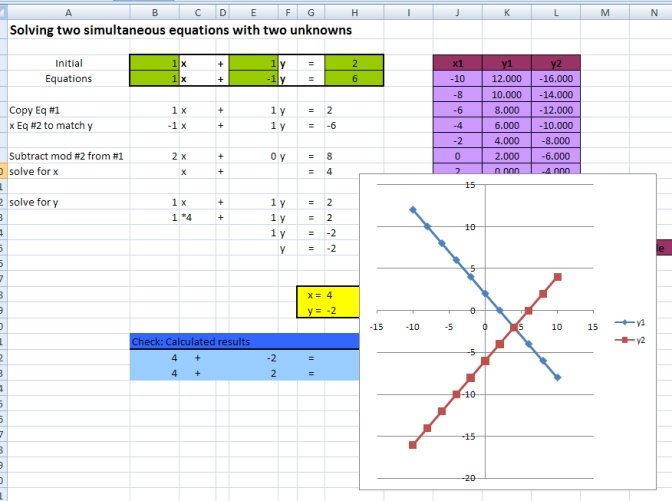 Solves two linear equations with two unknowns, graphing the lines. An Algebra II student ought to be able to expand it to do three equations.